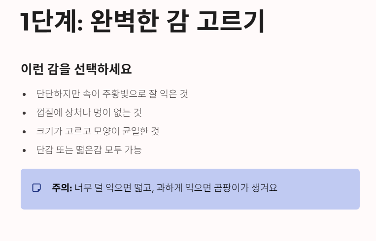 말리는 과정에서 하루 1~2회 감을 살짝 주물러 주거나 위치를 바꿔주면 속까지 고르게 마릅니다. 겉은 말랐는데 속이 물렁한 상태를 방치하면 곰팡이가 생길 수 있어 이 단계가 매우 중요합니다.