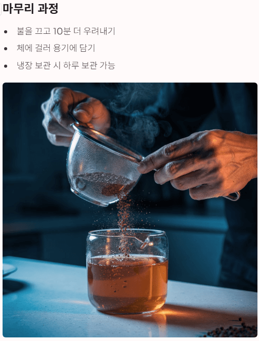 끓인 뒤 불을 끄고 10분 정도 두면 향이 더 잘 우러난다. 체에 걸러 보온병이나 냉장 보관용 용기에 담으면 하루 정도는 충분히 보관할 수 있다. 차갑게 마셔도 깔끔한 맛이 살아있어 여름철에도 잘 어울린다.