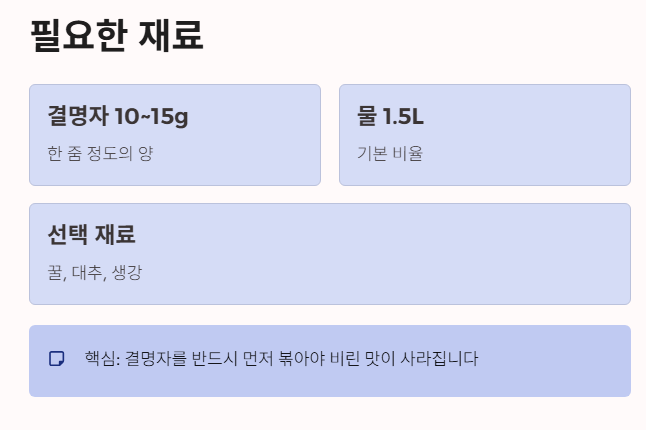 - 물 비율은 1.5L 기준 결명자 10~15g