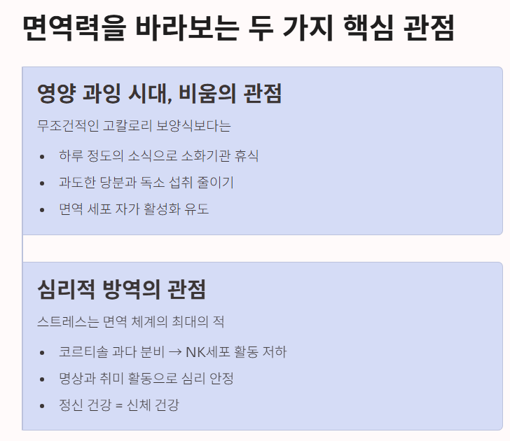 - 영양 과잉의 시대, 비움의 관점: 현대인은 영양 부족보다는 과도한 당분과 독소 섭취가 문제입니다. 면역력이 떨어졌을 때 무조건 고칼로리 보양식을 먹기보다는, 하루 정도 소식하며 소화 기관에 휴식을 주는 '비움'이 오히려 면역 세포 활성화에 도움을 줄 수 있습니다.