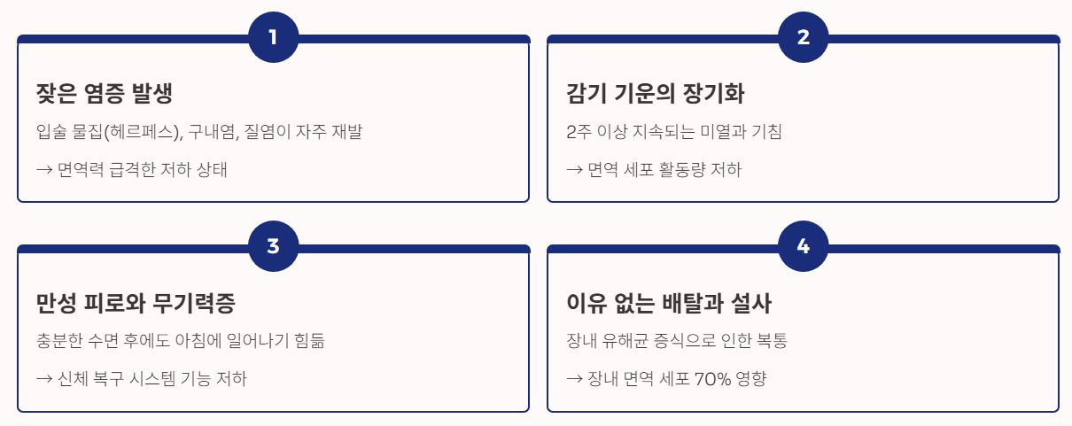 우리 몸은 면역 체계에 문제가 생기면 여러 경로로 신호를 보냅니다. 다음 증상 중 3가지 이상 해당한다면 지금 바로 관리가 필요합니다.