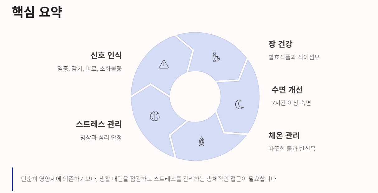 면역력 저하는 염증, 감기, 피로, 소화 불량이라는 신호로 우리에게 경고를 보냅니다. 이를 해결하기 위해서는 장 건강 관리, 양질의 수면, 체온 유지라는 3단계 전략이 필수적입니다. 단순히 영양제에 의존하기보다 나의 생활 패턴을 점검하고 스트레스를 관리하는 총체적인 접근이 필요합니다.