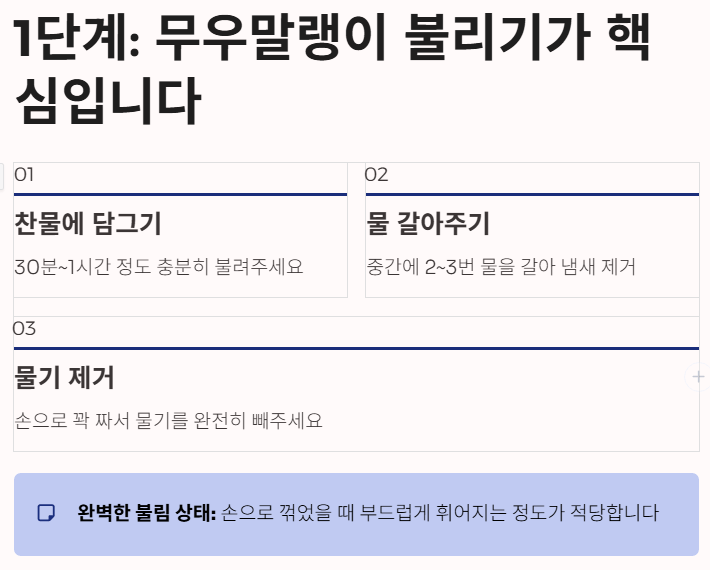 - 충분히 불린 뒤에는 물기를 꼭 짜는 것이 핵심입니다