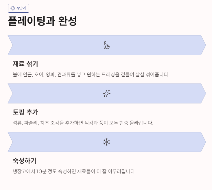 볼에 연근·오이·양파·견과류를 넣고 원하는 드레싱을 곁들여 살살 섞어줍니다. 여기에 석류, 파슬리, 치즈 조각을 추가하면 색감과 풍미 모두 한층 올라갑니다. 냉장고에서 10분 정도 숙성하면 재료들이 더 잘 어우러집니다.