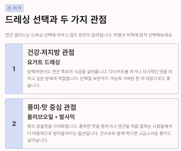 연근 샐러드는 드레싱 선택에 따라 느낌이 완전히 달라집니다.