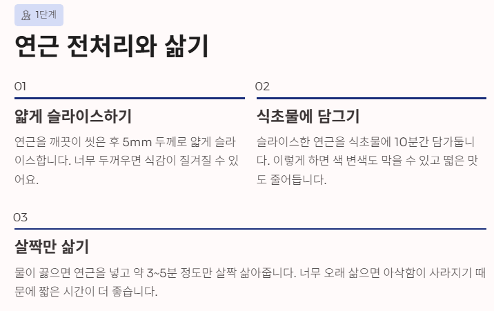 연근은 얇게 슬라이스한 뒤 식초물에 10분간 담가 두는 것이 핵심입니다. 이렇게 하면 색 변색도 막을 수 있고 떫은 맛도 줄어듭니다.